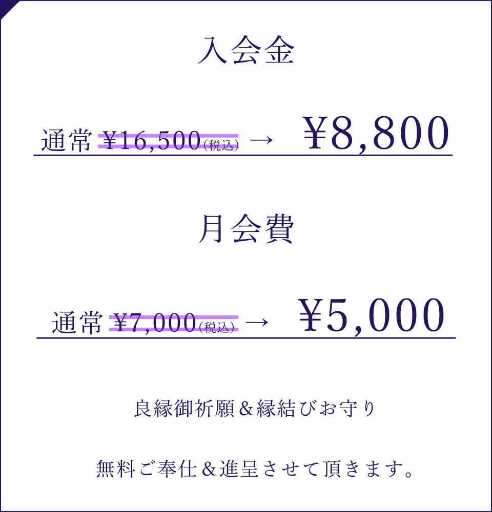 ここは神地である神社ですので、皆様真剣な出会いを求めています。いい加減な方や遊び半分な方はおりません。そんな素敵な会員様たちと、完全1対1のお見合いをしながら、複数の方とデートを重ねて、最高の結婚相手(恋人)を見つけましょう!最良のご縁を結ぶ他にはない神社らしいシステムで、ワクワク楽しく婚活しましょう!